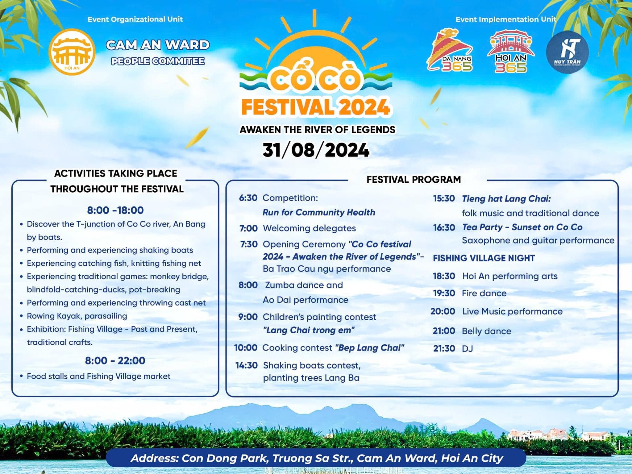 Ngày 31/8/2024, dòng sông Cổ Cò huyền thoại sẽ được đánh thức qua sự kiện “LỄ HỘI CỔ CÒ 2024” tại công viên Lăng Bà Cồn Động, phường Cẩm An, Hội An. Đây là cơ hội tuyệt vời để hòa mình vào không khí náo nhiệt của các hoạt động văn hóa đặc sắc, đồng thời khám phá những nét đẹp truyền thống của một vùng đất giàu lịch sử và văn hóa.