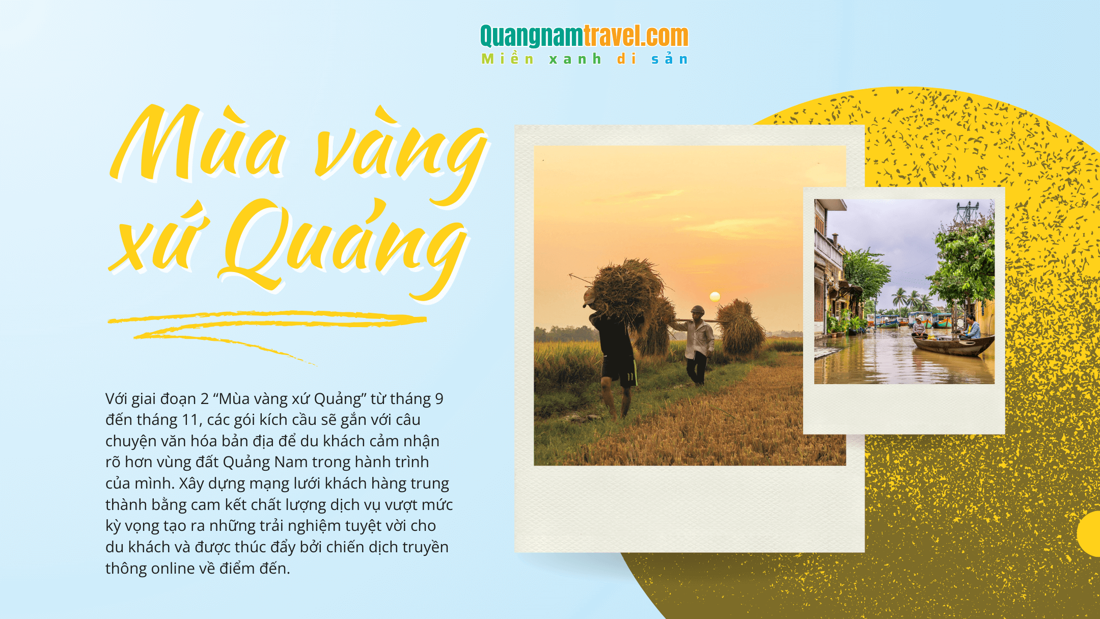 Giai đoạn 2 "Mùa vàng xứ Quảng" sẽ diễn ra từ tháng 9 đến tháng 11 năm 2024, mang đến cho du khách những trải nghiệm thú vị, đặc biệt là trong mùa mưa. Du khách khi đến Quảng Nam trong dịp này sẽ có cơ hội tận hưởng nhiều gói sản phẩm du lịch độc đáo với nhiều mức giá ưu đãi hấp dẫn. Từ các dịch vụ nghỉ dưỡng sang trọng đến các hoạt động khám phá thiên nhiên, đồng quê hay lễ hội, mỗi sản phẩm đều hướng tới việc thúc đẩy việc kinh doanh du lịch và góp phần đạt các chỉ tiêu phát triển bền vững cho du lịch Quảng Nam trong năm 2024.