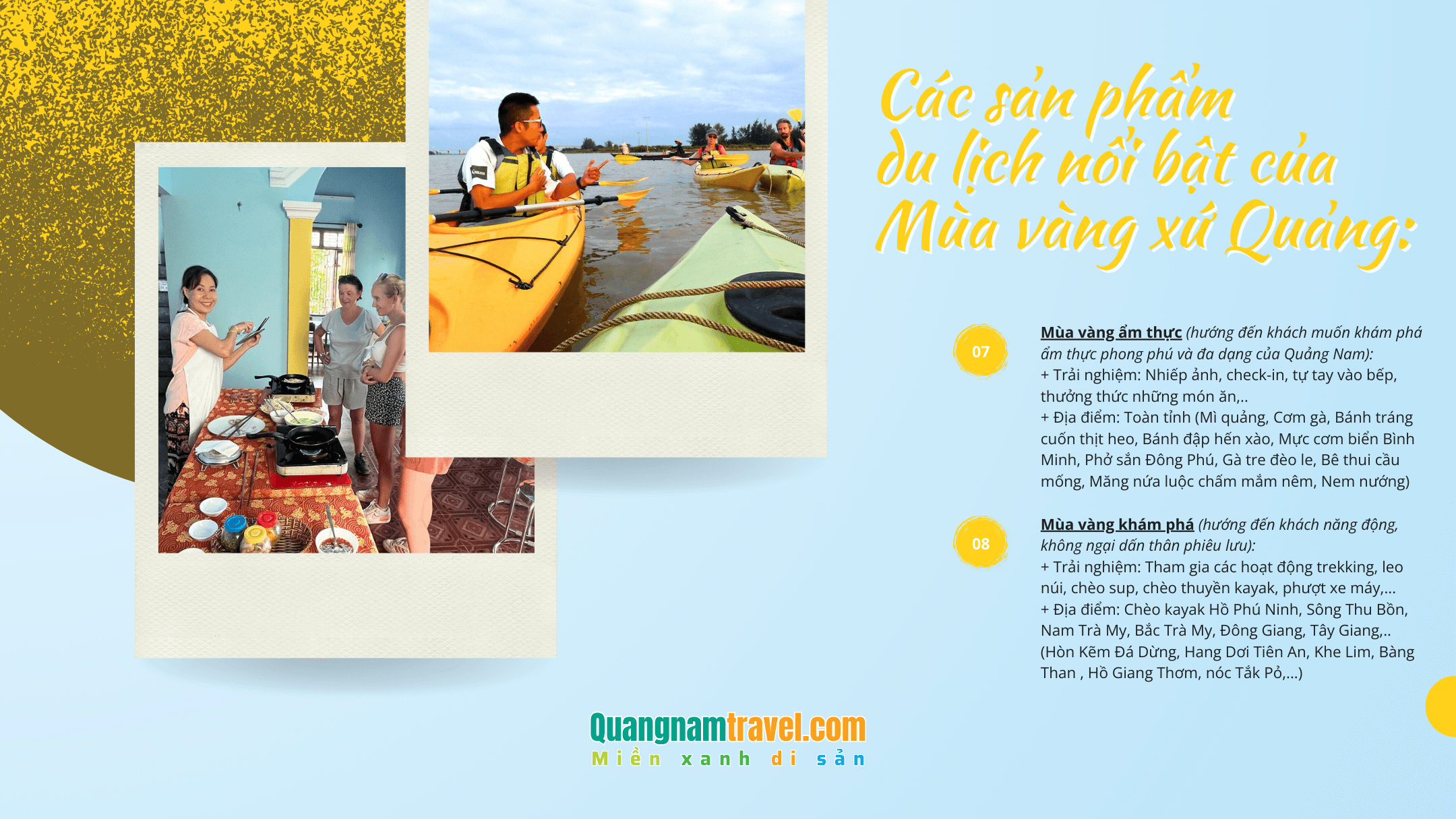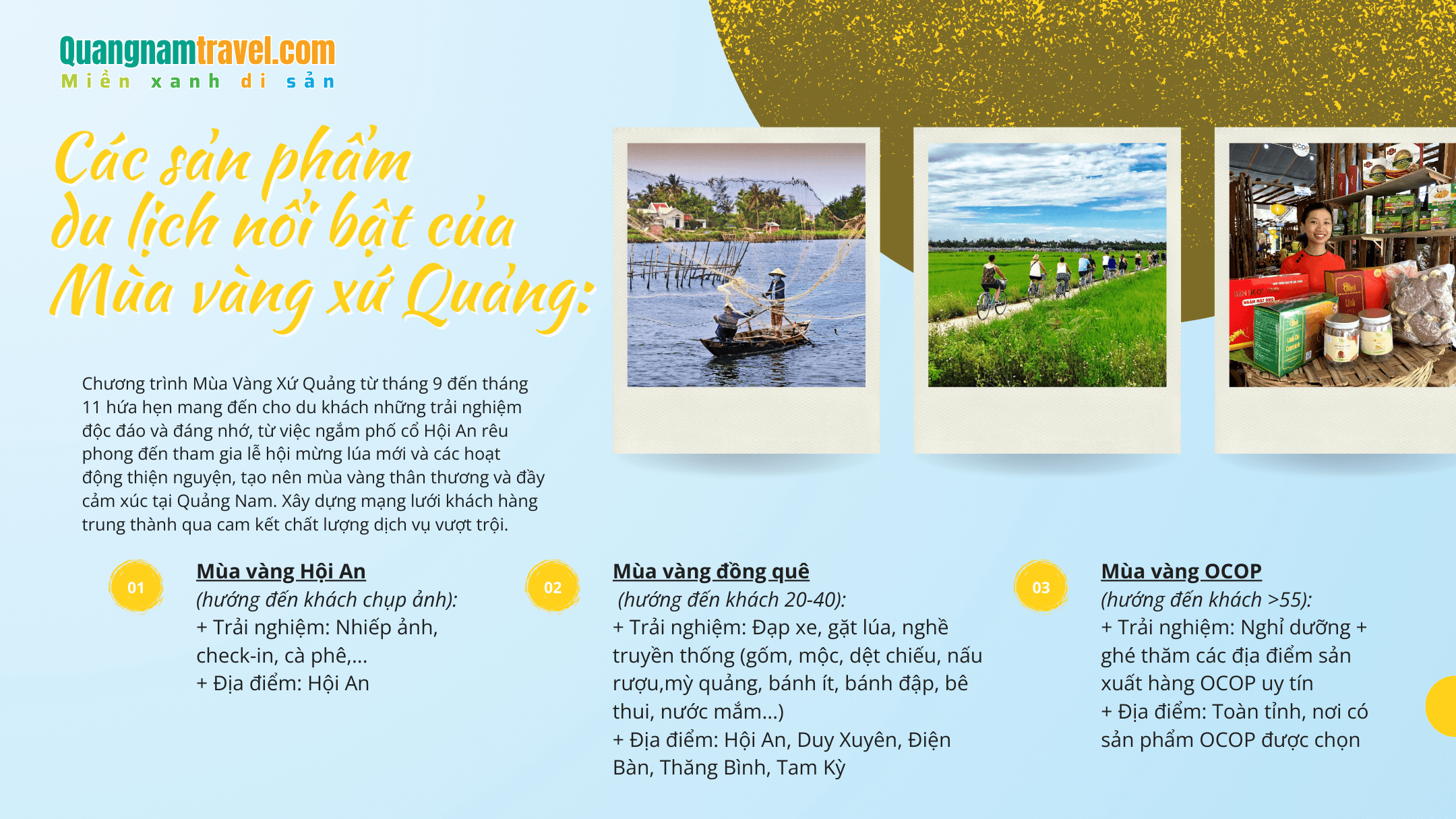 Mùa vàng xứ Quảng 2024 hứa hẹn sẽ mang tới những trải nghiệm tuyệt vời cho du khách với các sản phẩm du lịch đặc sắc như: Mùa vàng phủ xanh, Mùa vàng đồng quê, Mùa vàng OCOP, Mùa vàng ẩm thực, Mùa vàng di sản, Mùa vàng bản sắc, Mùa vàng lễ hội,...