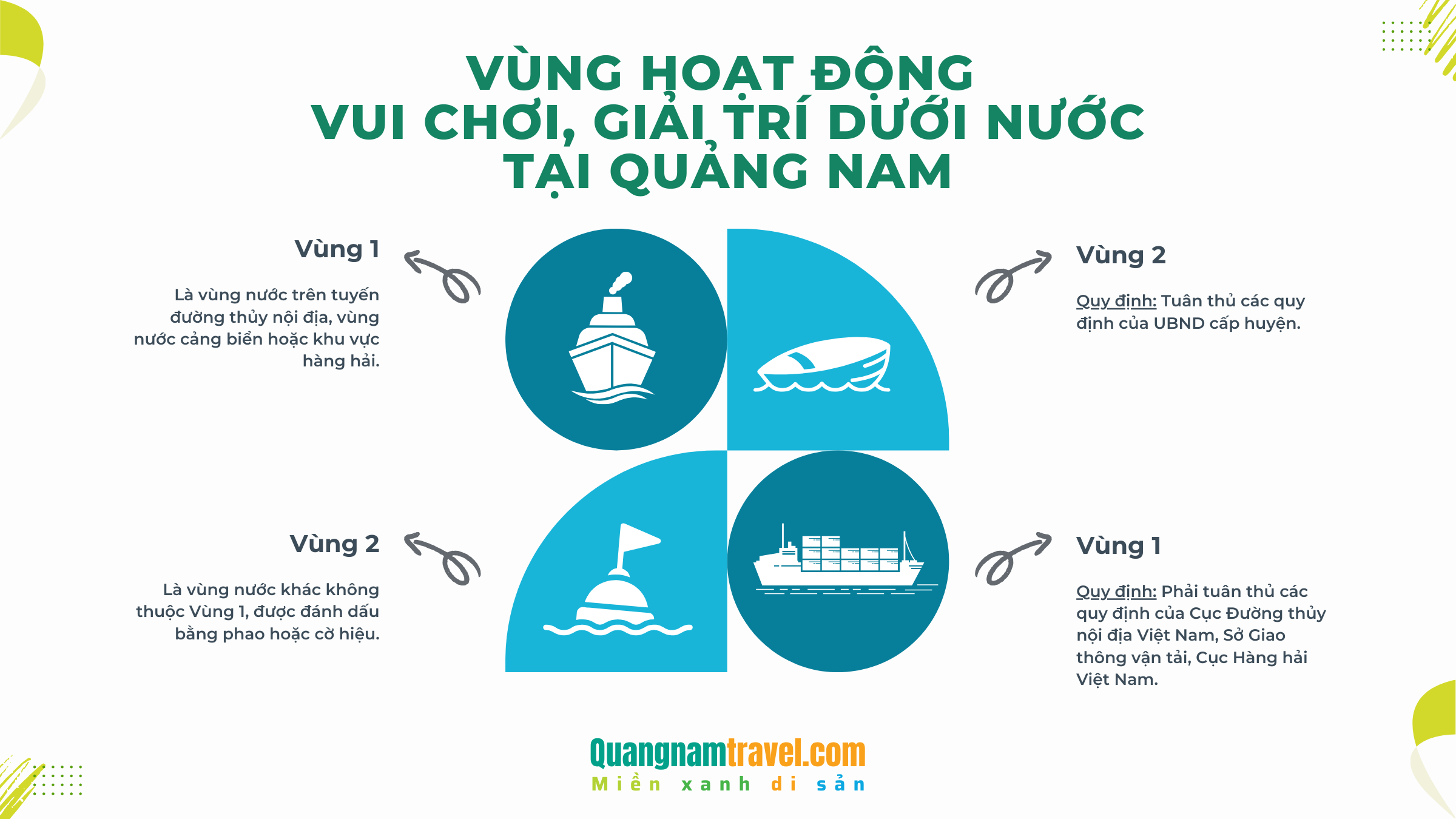 Các vùng hoạt động vui chơi, giải trí dưới nước được phân loại thành Vùng 1 (các vùng nước trên tuyến đường thủy nội địa và các khu vực nước cảng biển) và Vùng 2 (các khu vực nước khác không thuộc Vùng 1). Việc phân loại này giúp quản lý và kiểm soát hiệu quả các hoạt động.
