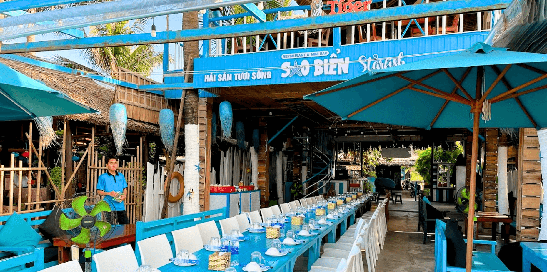 Nhà hàng Sao Biển mang đến trải nghiệm ẩm thực biển tuyệt vời với view biển tuyệt đẹp và phong cách trẻ trung với tông màu xanh trắng. Từ mọi mọi ngóc ngách của nhà hàng, bạn đều có thể tạo ra những bức ảnh sống ảo ấn tượng.